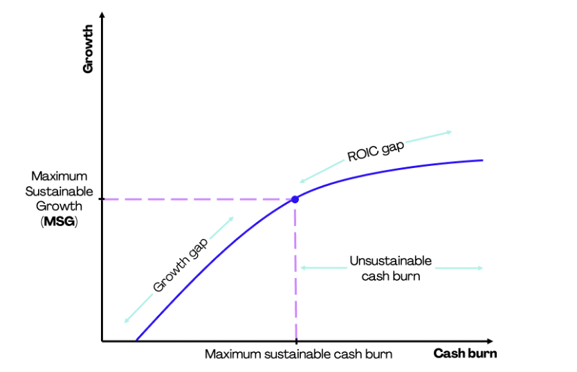 Here we introduce a key concept: the Maximum Sustainable Growth (MSG), which we define as the growth provided by the highest rate of cash burn that enables the required development to attract new investors, whilst simultaneously allowing the company to reach net cash breakeven. All within a cash runway that can be supported by the current shareholders.