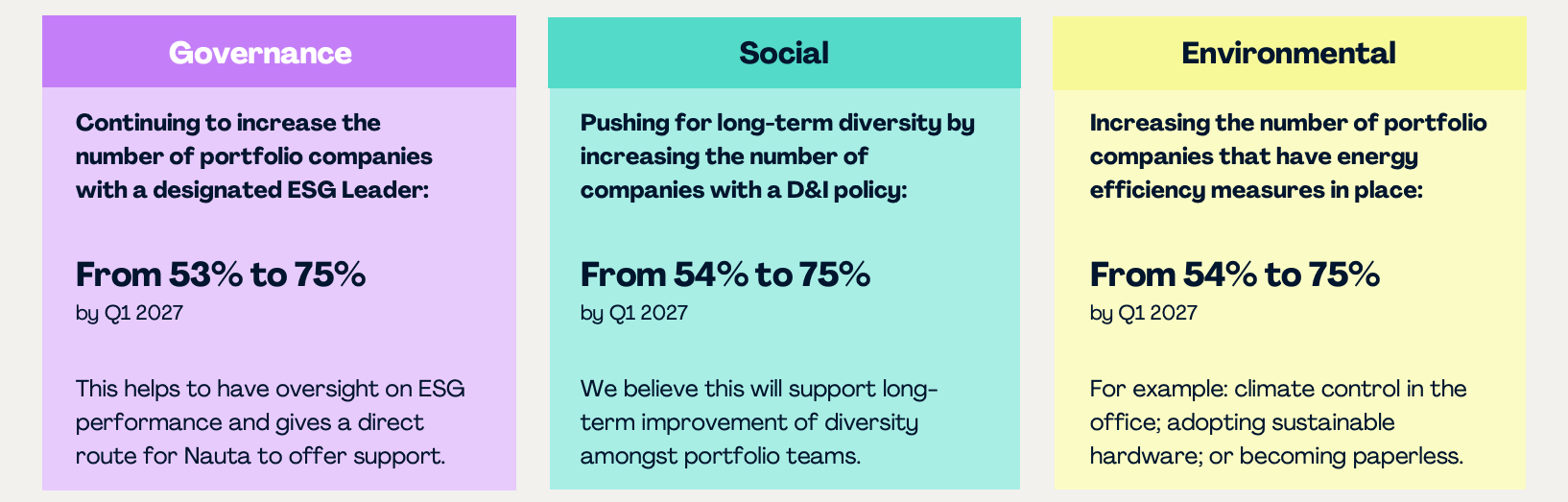 Looking ahead, we have decided to set ambitious targets over the long-term, focusing across all three pillars and reaching at least 75% of companies in the portfolio with a designated ESG leader appointed; a D&I policy; and energy efficiency measures in place.
